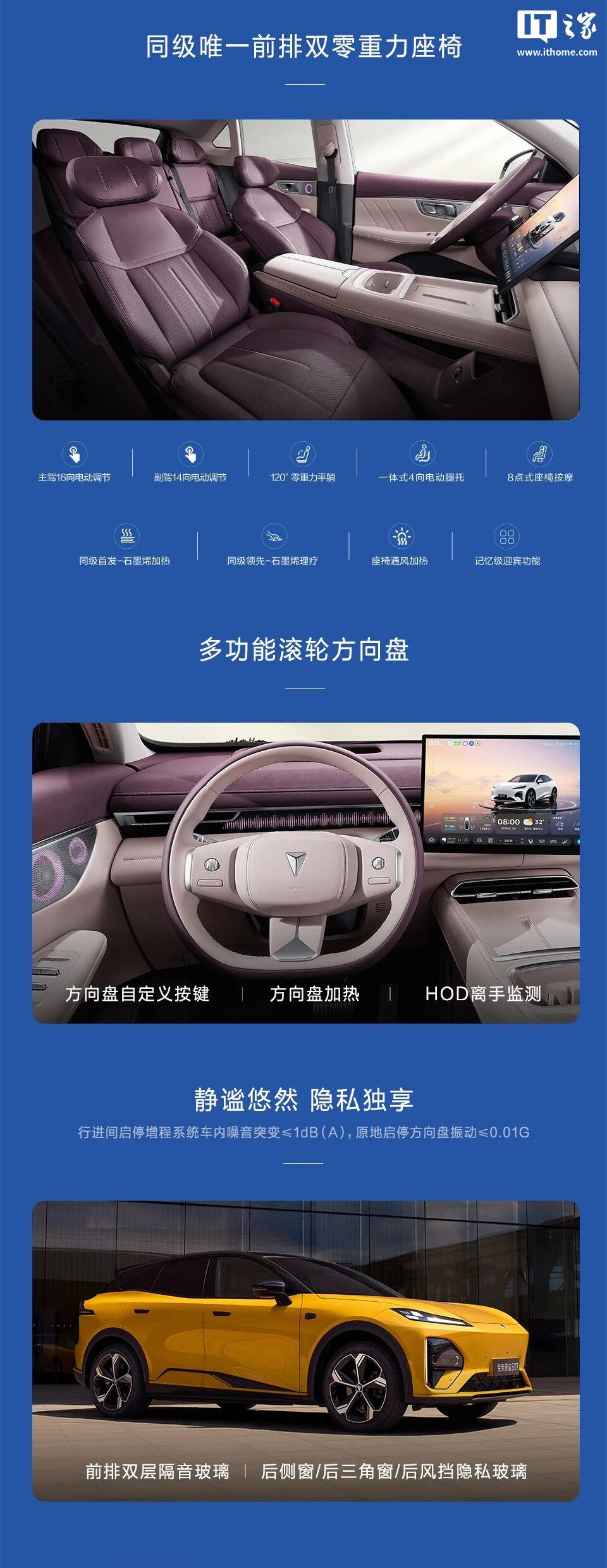 新车还拥有多功能滚轮方向盘(方向盘自定义按键、方向盘加热、HOD 离手监测)、前排双层隔音玻璃、后侧窗 / 后三角窗 / 后风挡隐私玻璃,行进间启停增程系统车内噪音突变≤1dB(A),原地启停方向盘振动≤0.01G。