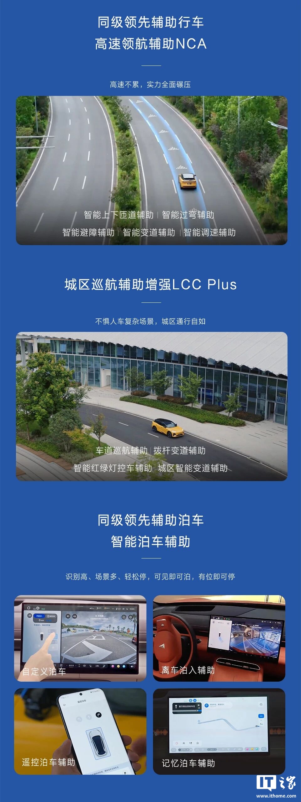 新车还支持高速领航辅助 NCA(智能上下匝道辅助 / 智能过弯辅助 / 智能避障辅助 / 智能变道辅助 / 智能调速辅助)、城区巡航辅助增强 LCC Plus(车道巡航辅助 / 拨杆变道辅助 / 智能红绿灯控车辅助 / 城区智能变道辅助)、智能泊车辅助(自定义泊车 / 离车泊入辅助 / 遥控泊车辅助 / 记忆泊车辅助)。