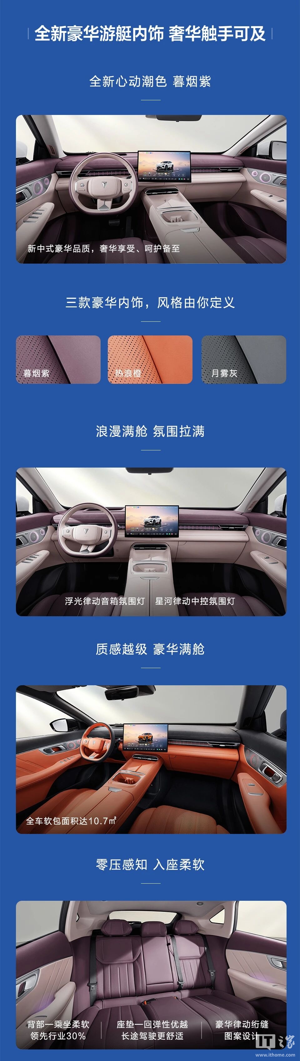 全新深蓝 S07 拥有全新豪华游艇内饰,提供暮烟紫、热浪橙、月雾灰 3 种风格,内置浮光律动音箱氛围灯和星河律动中控氛围灯。新车还在舒适性上进行了优化,全车软包面积达 10.7m²,配备同级唯一前排双零重力座椅;后排座椅座垫拥有良好的回弹性、靠背号称乘坐柔软领先行业 30%,同时采用豪华律动绗缝图案设计。