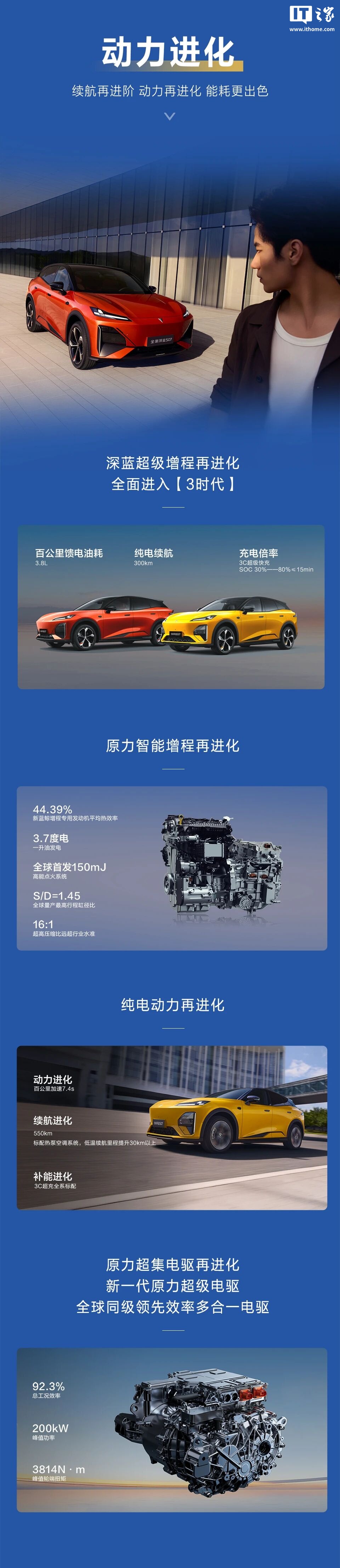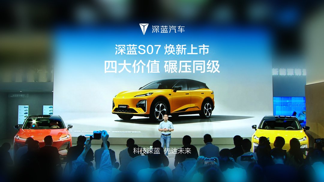 全新深蓝 S07 同级首发可变自适应悬架,增程版采用深蓝超级增程技术:百公里馈电油耗 3.8L、纯电续航 300km、3C 超级快充(S0C 30%—80%<15min);搭载新蓝鲸增程专用发动机,平均热效率 44.39%、一升油发电 3.7 度电、全球首发 150mJ 高能点火系统、拥有 S / D=1.45 全球量产最高行程缸径比 + 16:1 超高压缩比。