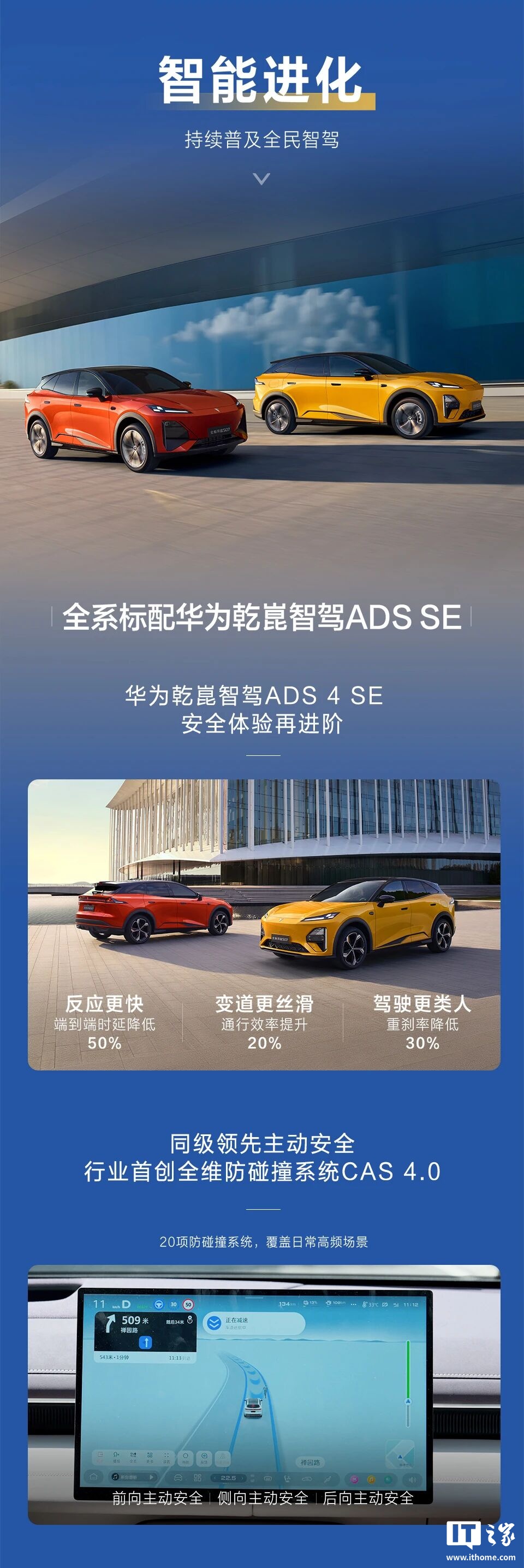 全新深蓝 S07 全系标配华为乾崑智驾 ADS SE,端到端时延降低 50%、通行效率提升 20%、重刹率降低 30%;行业首创全维防碰撞系统 CAS 4.0,内置 20 项防碰撞系统,覆盖日常高频场景,支持前向、侧向、后向主动安全。