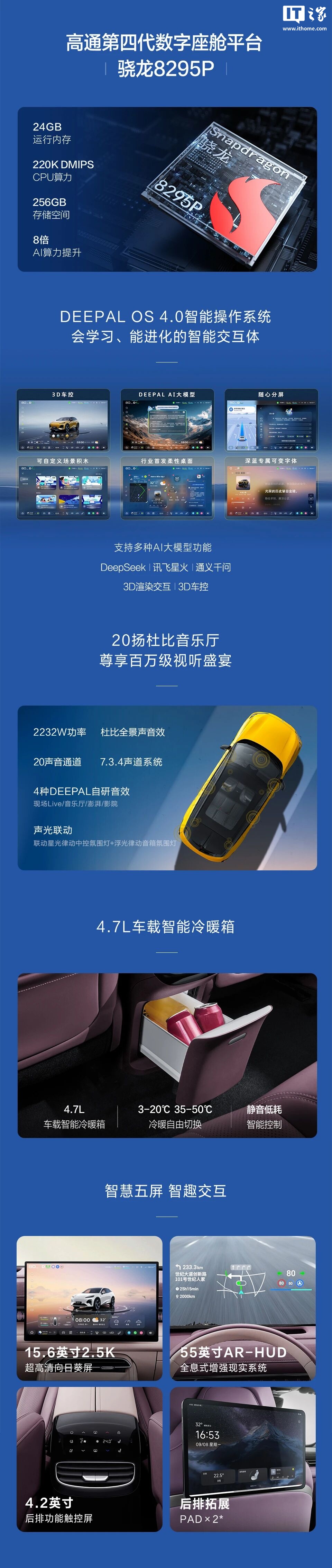 长安全新深蓝 S07 搭载高通第四代数字座舱平台“骁龙 8295P”,拥有 24GB 运行内存 + 256GB 存储空间,CPU 算力 220K DMIPS,宣称 AI 算力提升 8 倍;预装 DEEPAL OS 4.0 智能操作系统,支持多种 AI 大模型功能(DeepSeek / 讯飞星火 / 通义千问)、3D 渲染交互、3D 车控。
